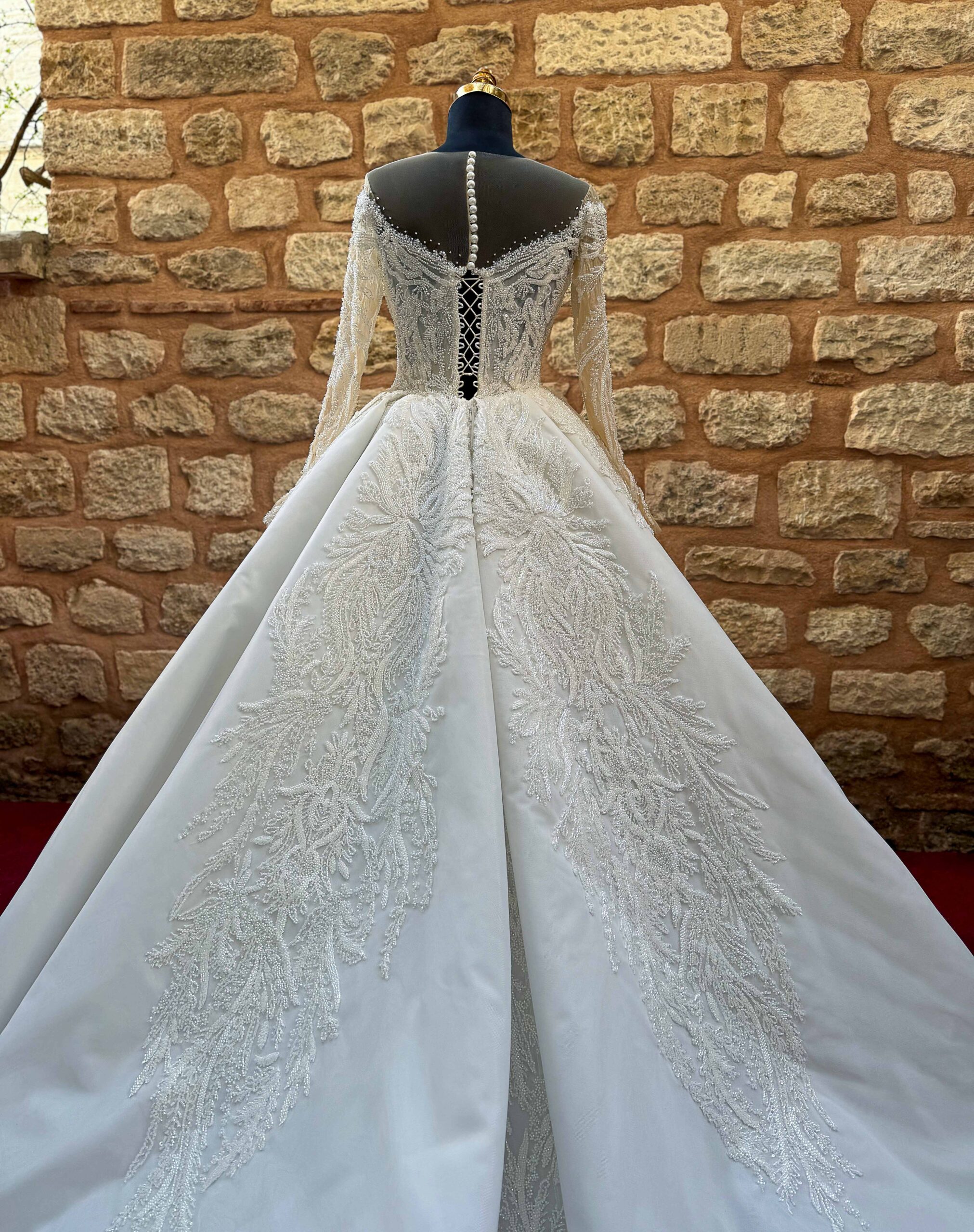 Bambi model wedding dress is an eye-catching design that combines classic princess cut with modern touches. The deep sweetheart neckline form exudes a feminine stance with an elegant décolleté, while the long sleeves highlight elegance with transparent lace details. Finely embroidered lace patterns on the upper body elegantly hug the body while offering a sparkling look.