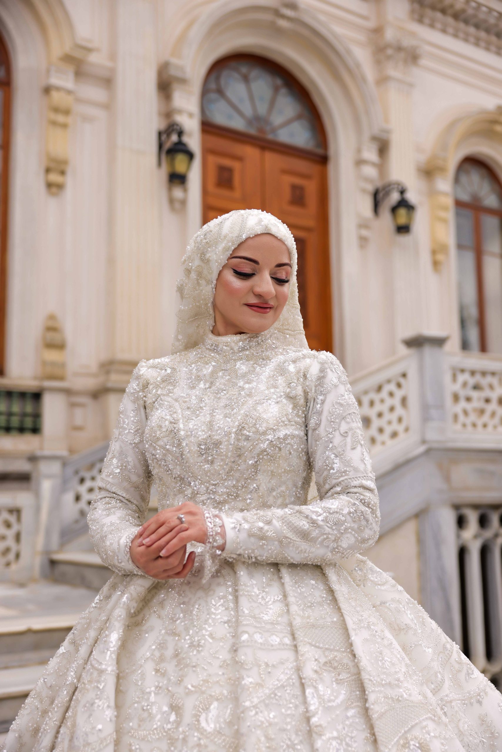 Offering elegance and magnificence together, Nilüfer Lotus Wedding Dress combines modern hijab lines with the magic of the classic princess model. Silver embroidered lace details combine with the nobility of off-white satin to create an eye-catching sparkle.