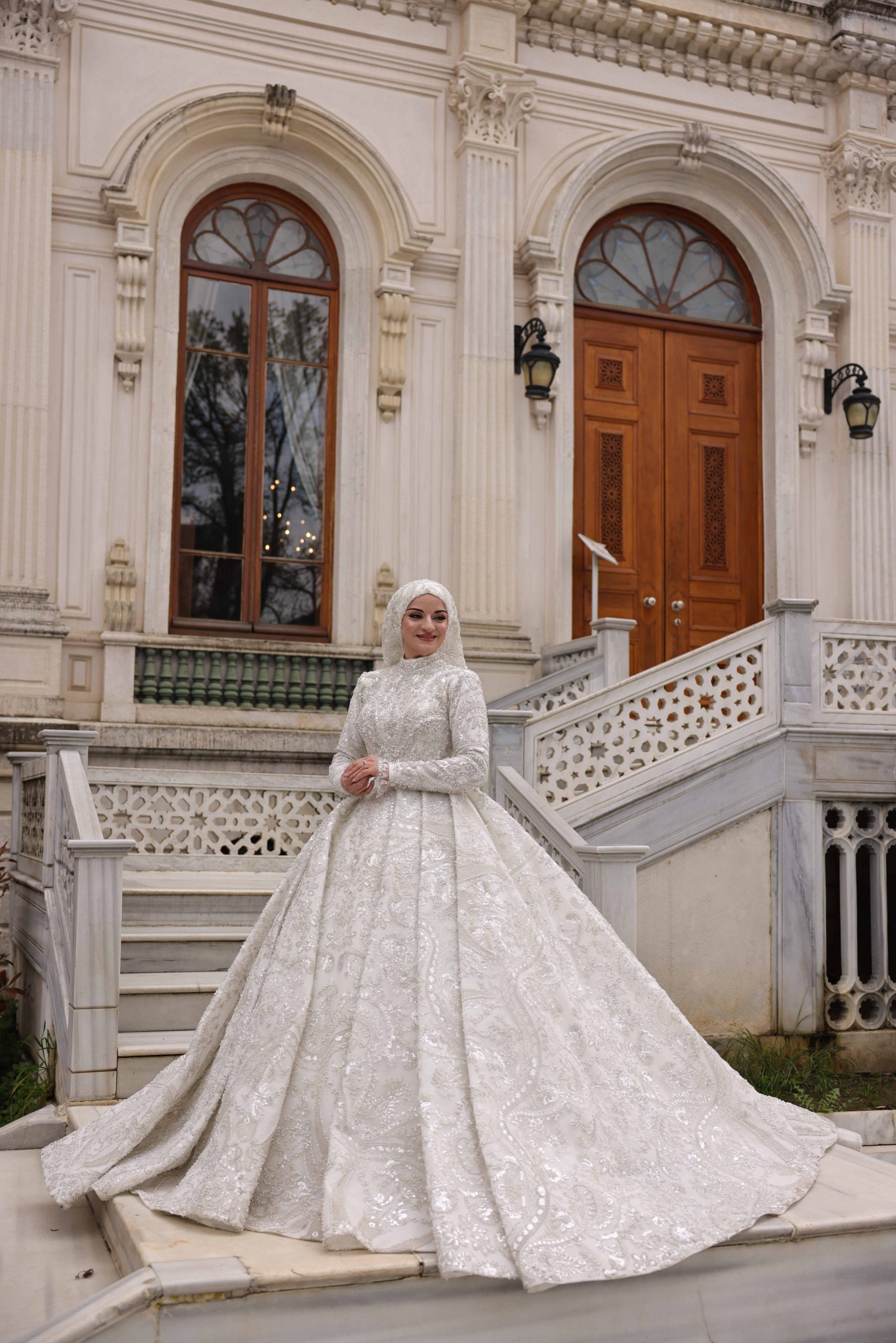 This special model, which adds simplicity to its elegance with its long-sleeved design and hijab-matching collar, is an ideal choice for brides who want to look both flashy and elegant. Its ball-type silhouette with its wide skirt volume leaves a fairy-tale effect in salon weddings, while the fine texture of the embroidery adds a noble splendor to the wedding dress.