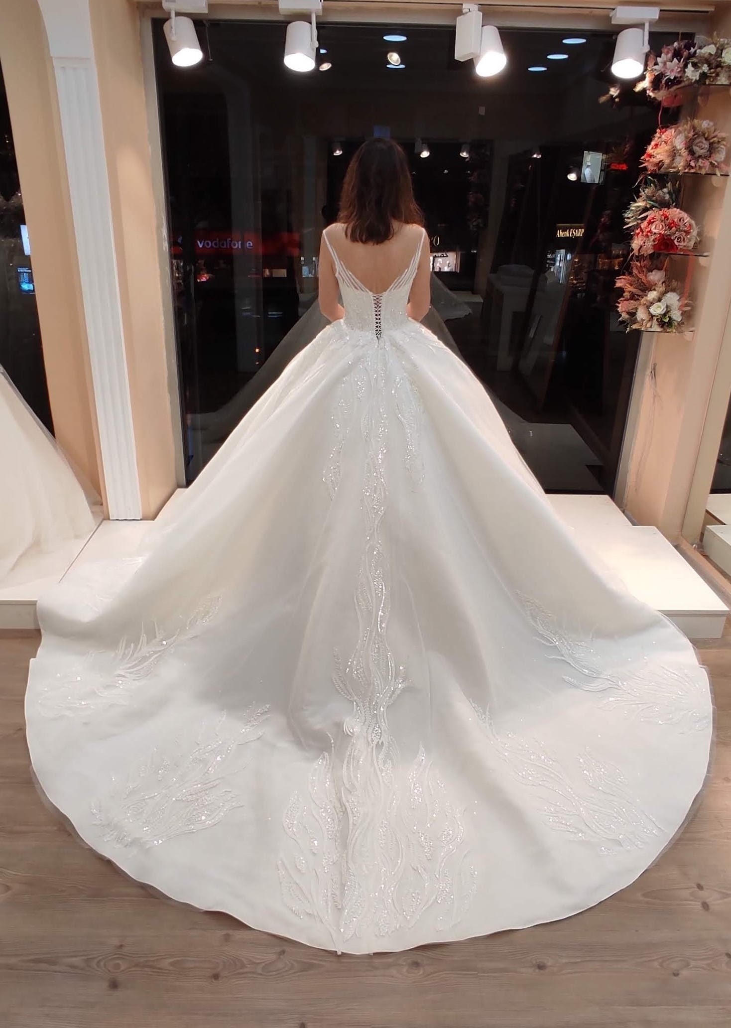 Vücut hatlarını zarifçe ortaya çıkaran bir model arıyordum ve bu gelinlik tam aradığım şeydi! Dantel işlemeleri çok kaliteli, balon kollar ise farklı ve şık bir hava katıyor. Kuyruk detayıyla birlikte kır düğünüme muhteşem uydu.