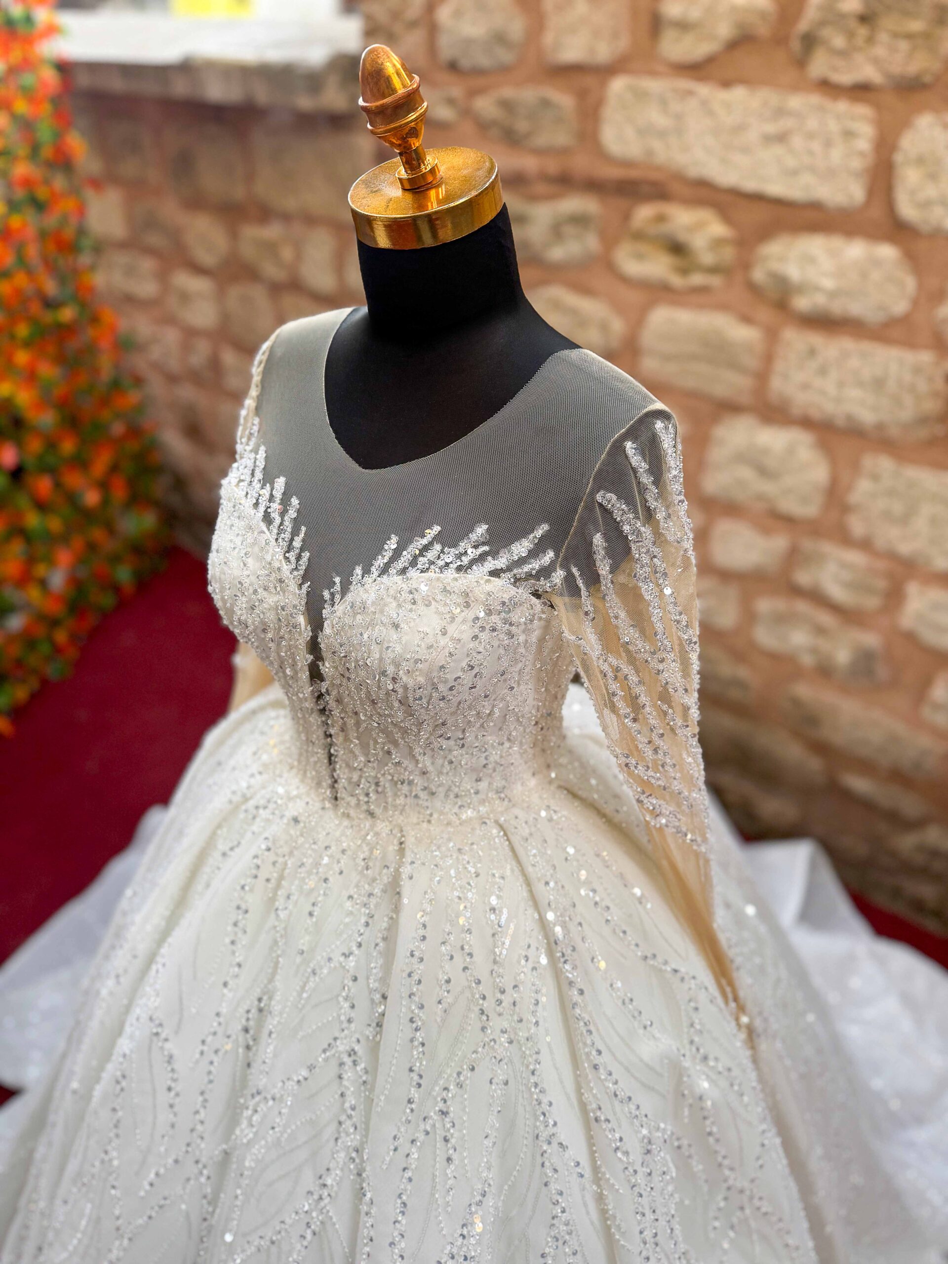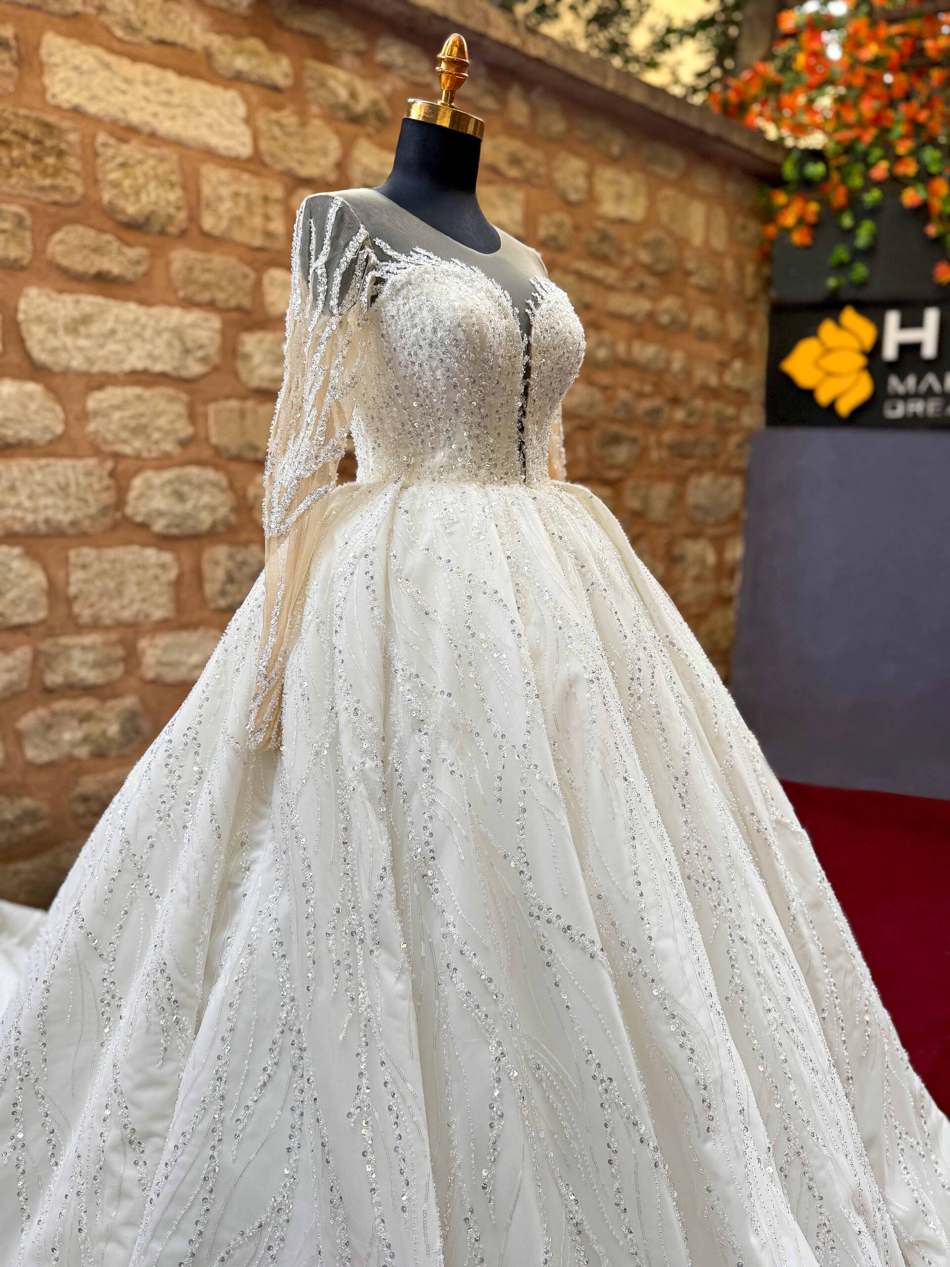 Off-white Princess wedding dress that offers elegance with its sweetheart neckline and long sleeve design. It creates an elegant and eye-catching look with its organza, tulle and fully embroidered lace fabric.