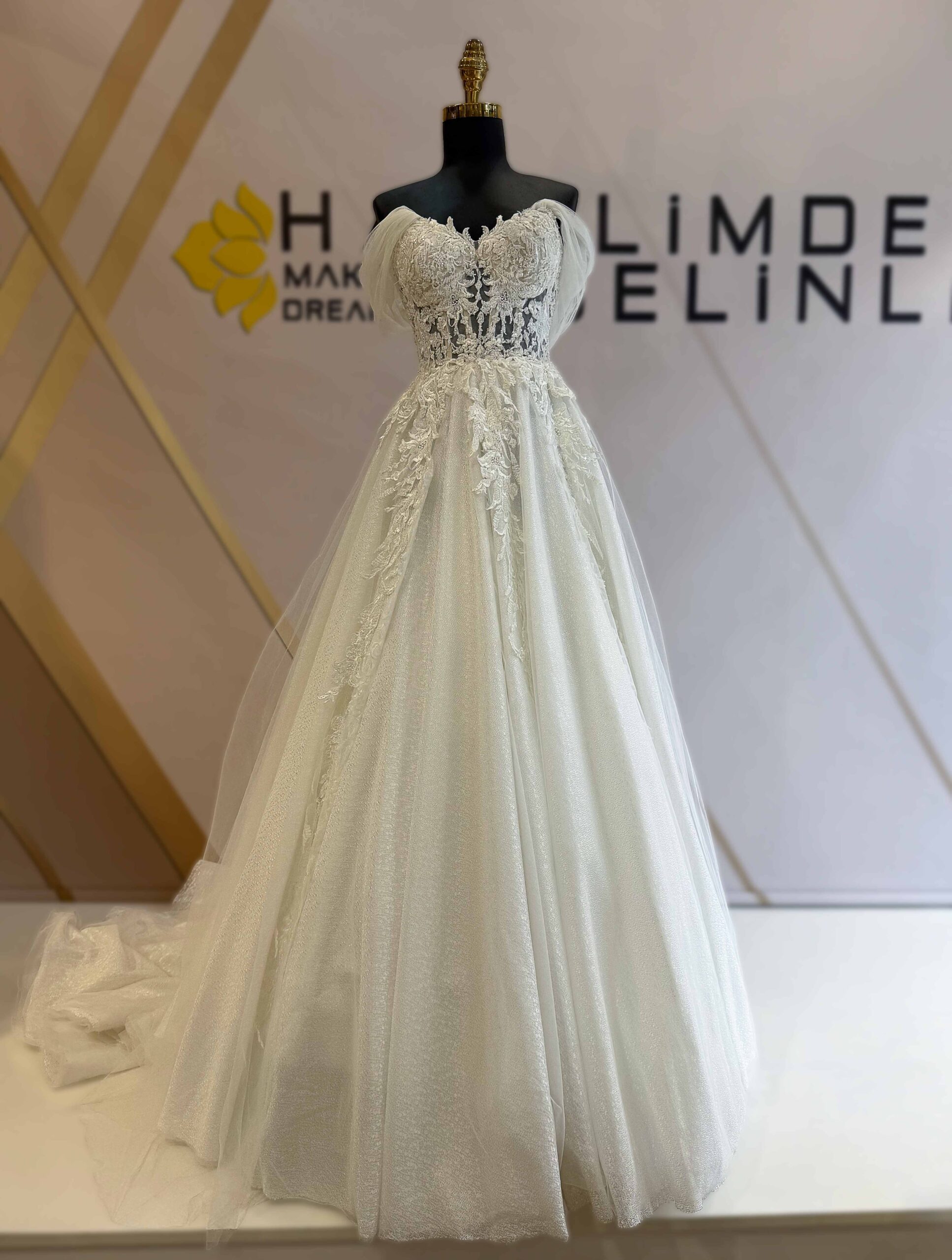 Designed with the perfect harmony of satin and embroidered glitter lace fabric, this model gives a classic and sophisticated look with its off-white color. The voluminous design and glittery lace details on the skirt provide elegant mobility throughout the wedding dress. It can be easily preferred on many special occasions, from salon weddings to prom concepts.