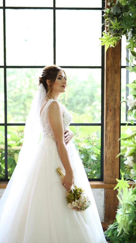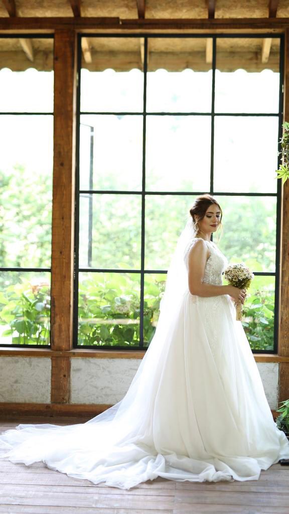 Bu gelinliği ilk giydiğim anda aynadaki yansıma beni büyüledi! Drapeli üst beden, belimi harika gösterdi ve V yaka detayıyla zarif bir duruş yakaladım. Yumuşak tüller sayesinde yürürken adeta süzülüyor gibi hissediyorsunuz. Tam bir sade şıklık!