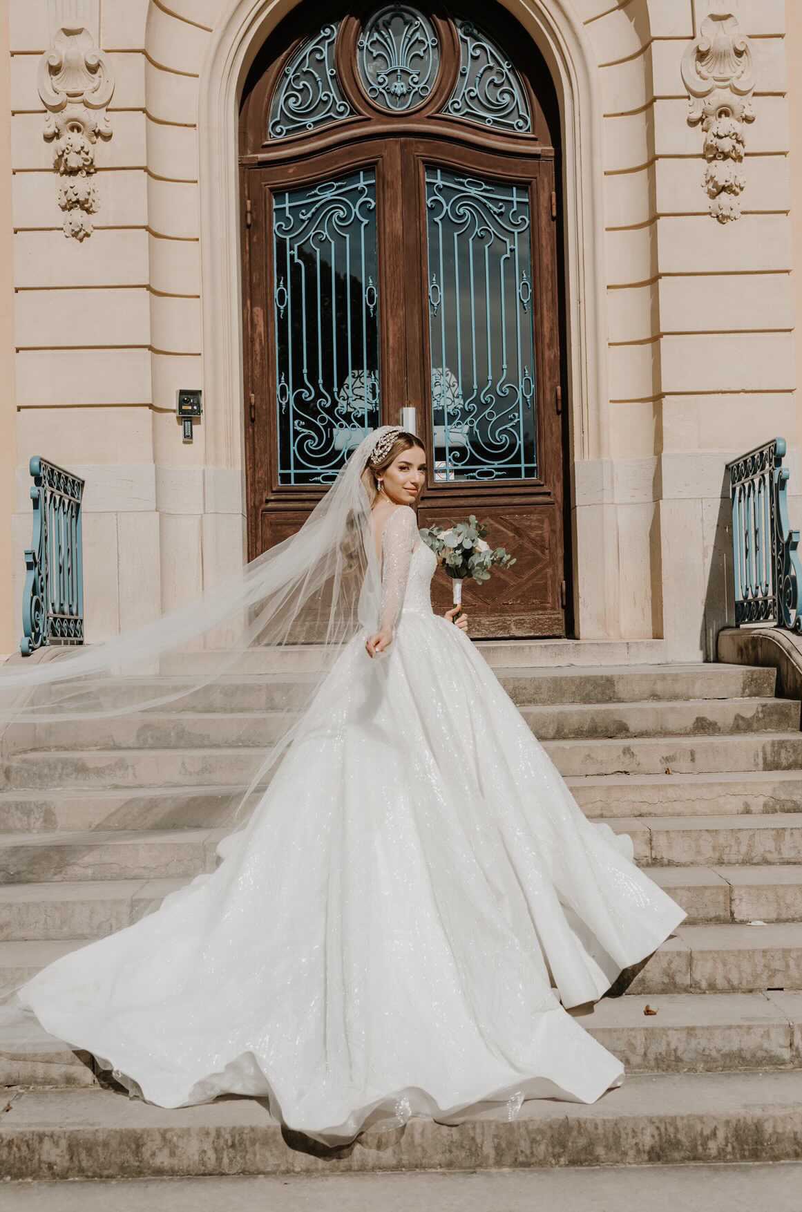 Zarafetin ve ihtişamın buluştuğu bu gelinlik, komple kristal işlemeli dantel kumaşıyla büyüleyici bir ışıltı sunar. Kalp yaka detayı romantik bir dokunuş sağlarken, uzun kollar asil bir duruş kazandırır. Kırık beyaz tonu, klasik şıklığı modern bir dokuyla harmanlarken, hacimli A kesim silüeti göz alıcı bir zarafet sunar.