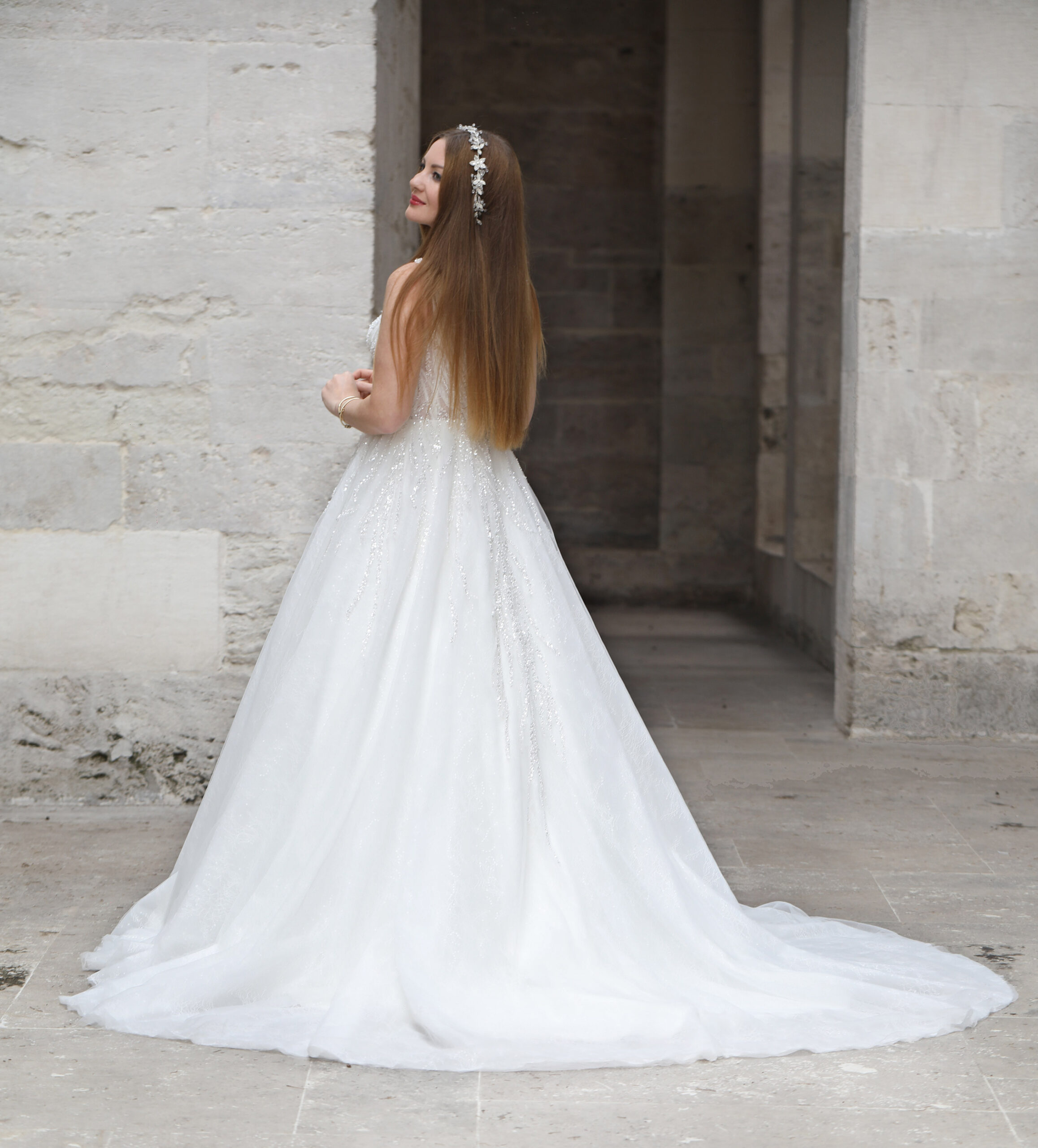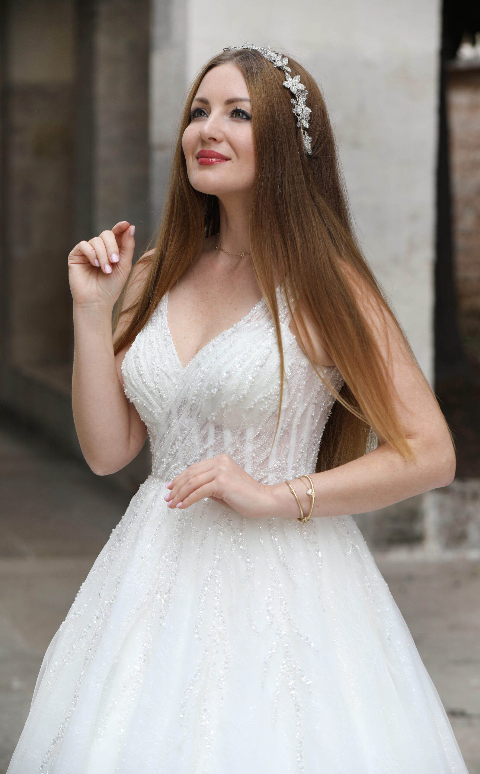 Işıltınızı yansıtan zarif bir tasarım! Payetli simli tül kumaşıyla göz kamaştıran bu A kesim gelinlik, kalp yaka ve askılı detaylarıyla romantik bir görünüm sunuyor.