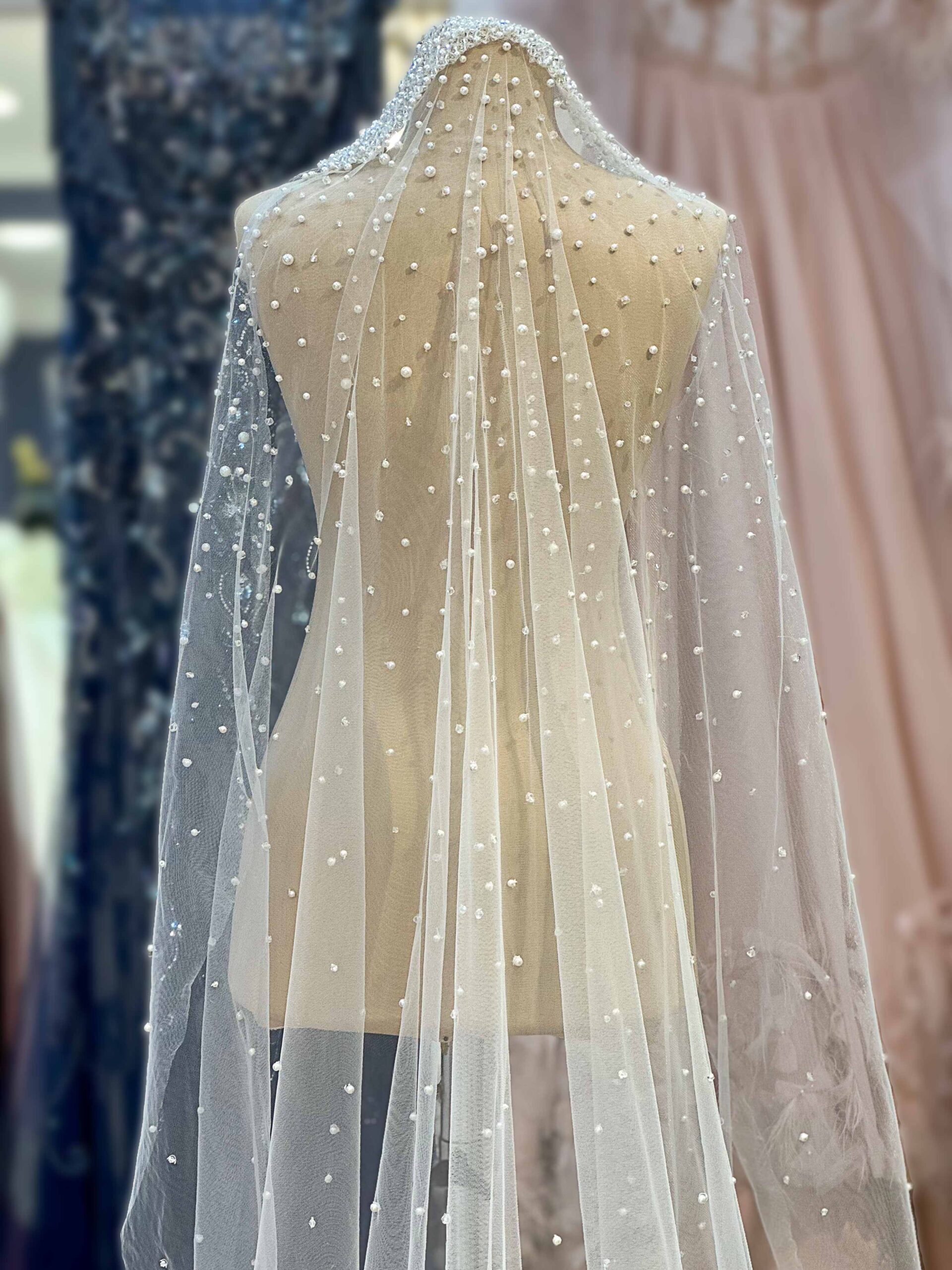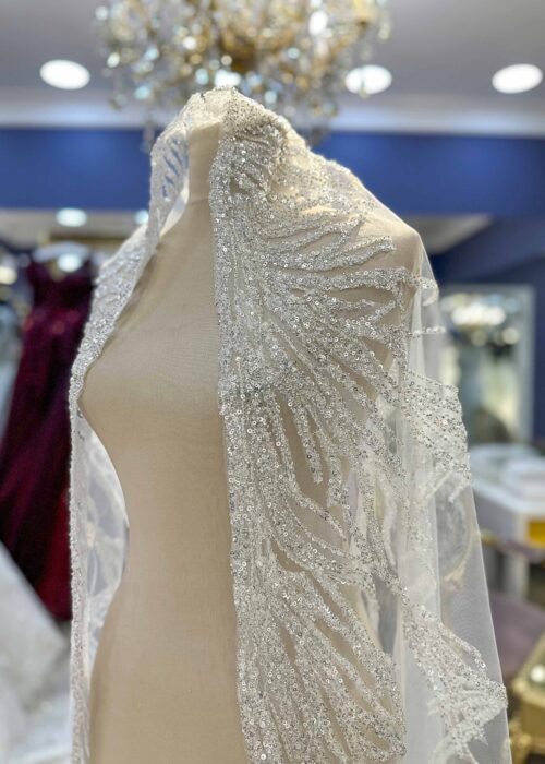 Zarif ve göz alıcı tasarımıyla dikkat çeken bu aksesuar, baş kısmı yoğun inci ve kristal işlemeli tül detaylarıyla şıklık sunar. Kırık beyaz rengiyle zarafeti tamamlayan bu özel parça, özel günleriniz için mükemmel bir seçimdir.