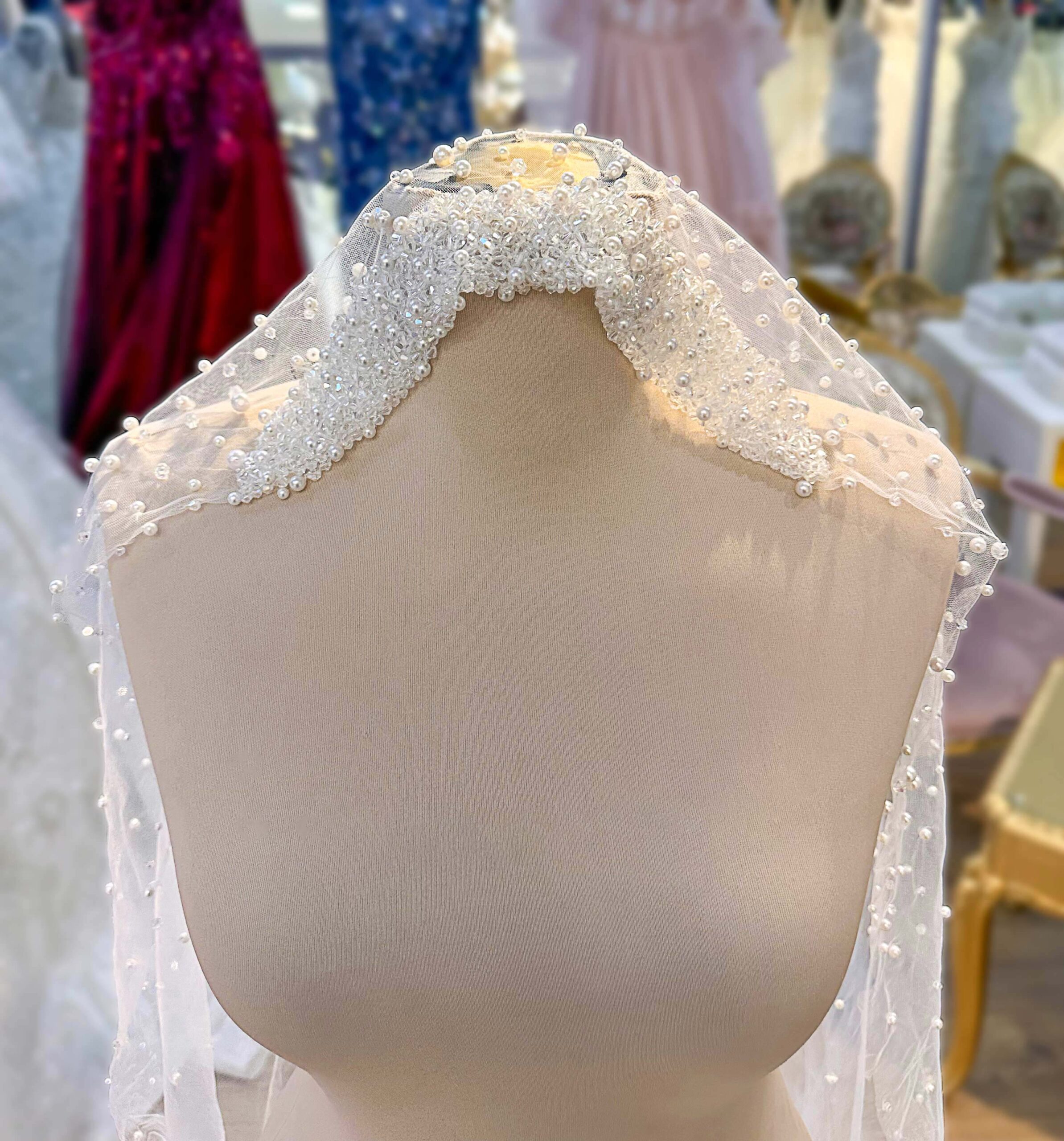 Baş Kısmı Yoğun Komple İnci Kristal İşlemeli Tül Duvak