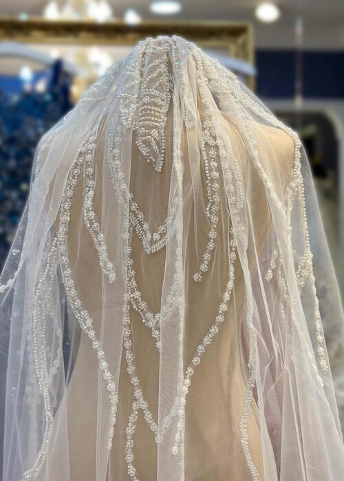Zarif ve göz alıcı tasarımıyla dikkat çeken bu aksesuar, baş kısmı yoğun inci ve kristal işlemeli tül detaylarıyla şıklık sunar.