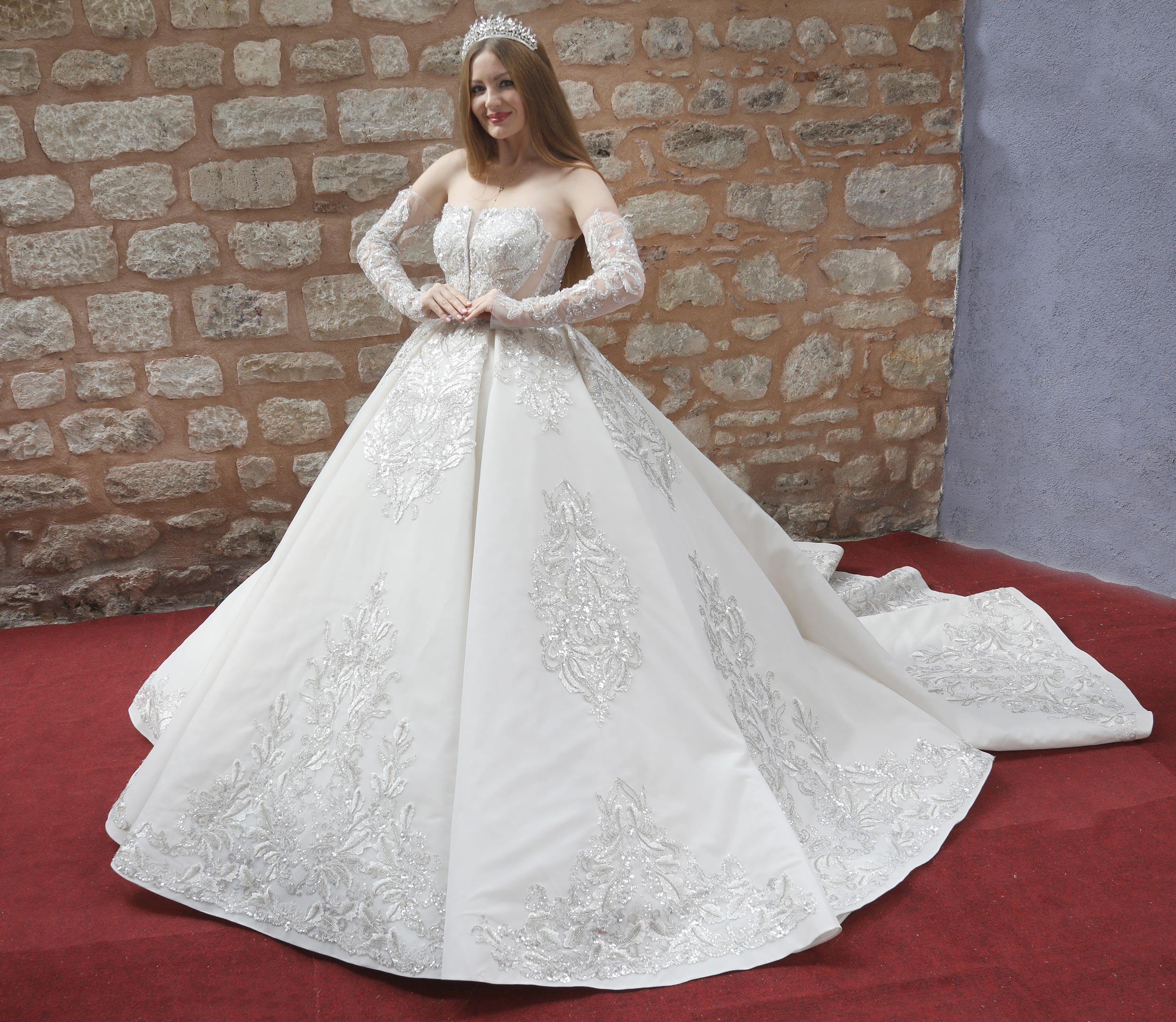 Düz Yaka Eldivenli Gümüş İşlemeli Prenses Gelinlik