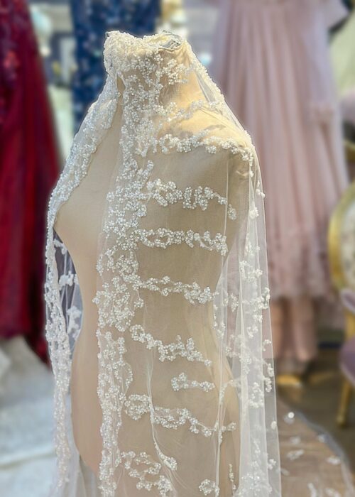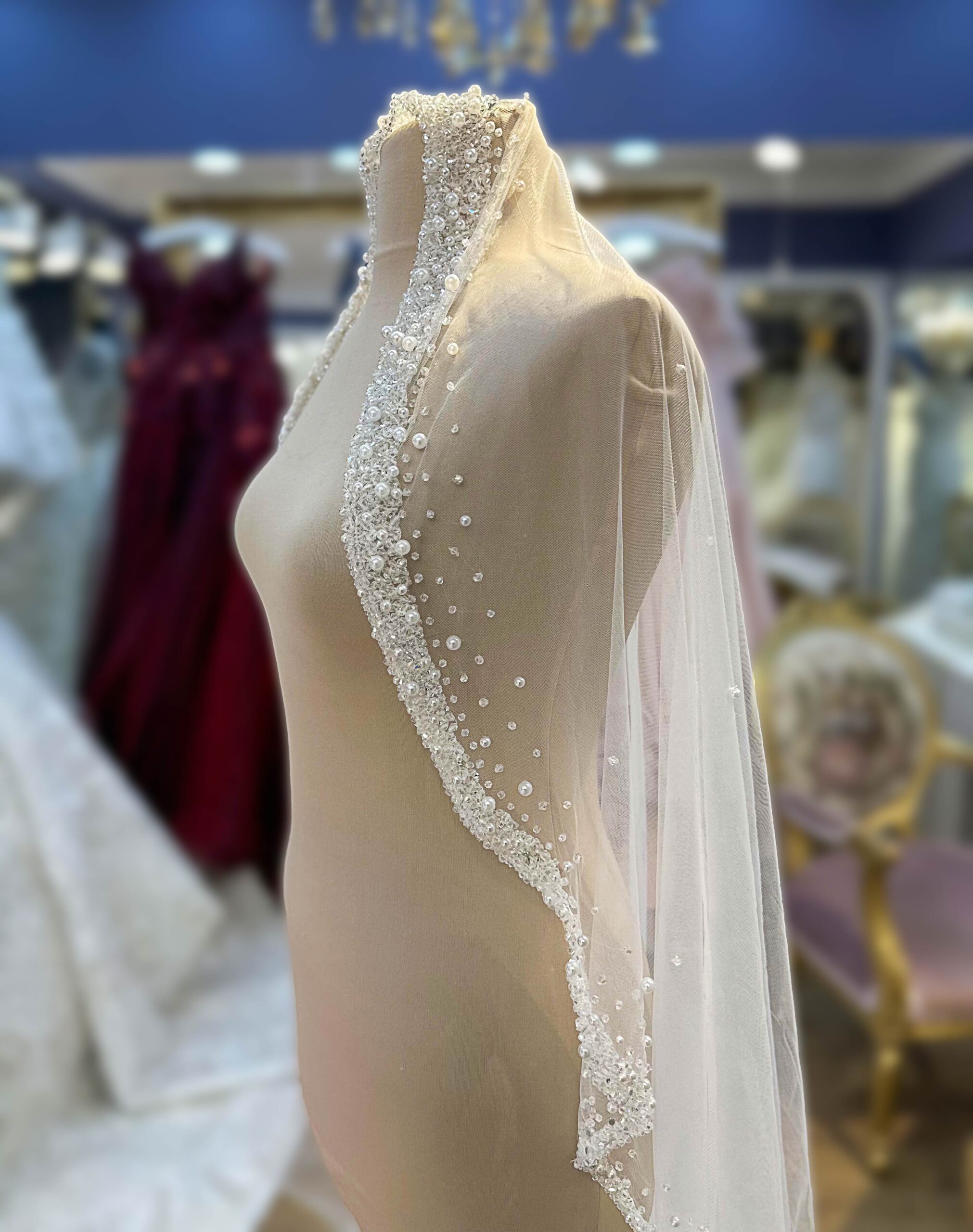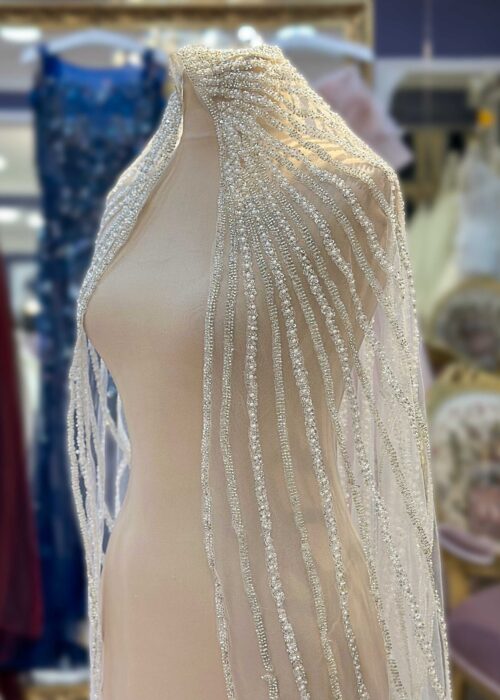 Zarafeti ve ışıltıyı bir araya getiren inci kristal işlemeli tül, kırık beyazın saf güzelliğiyle buluşuyor. Özel tasarımıyla şıklığınıza zarif bir dokunuş katın.