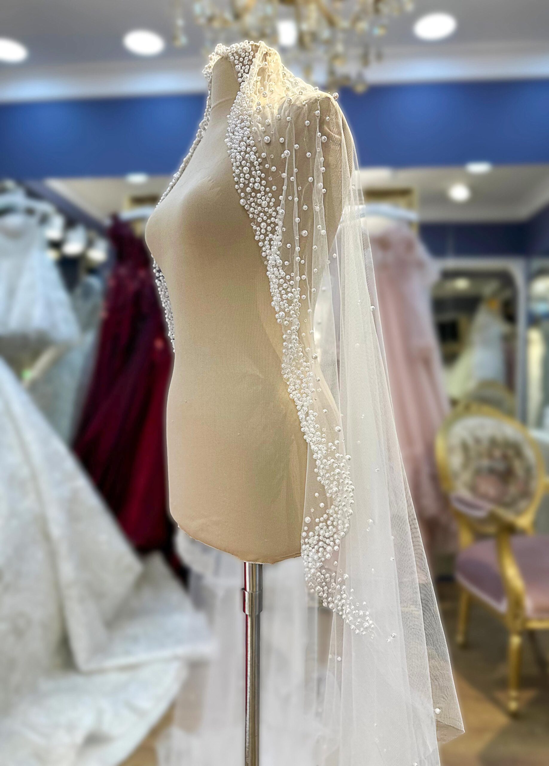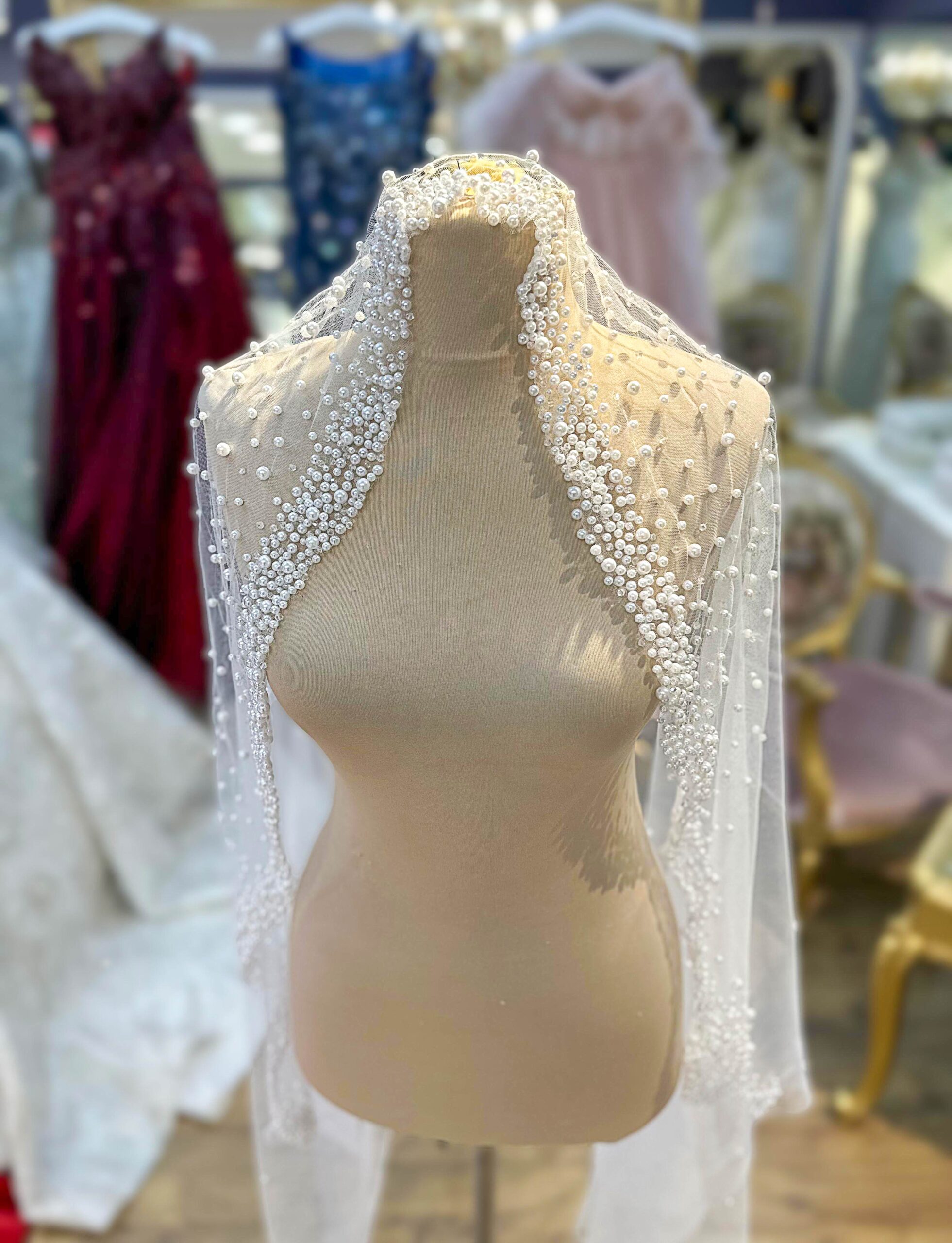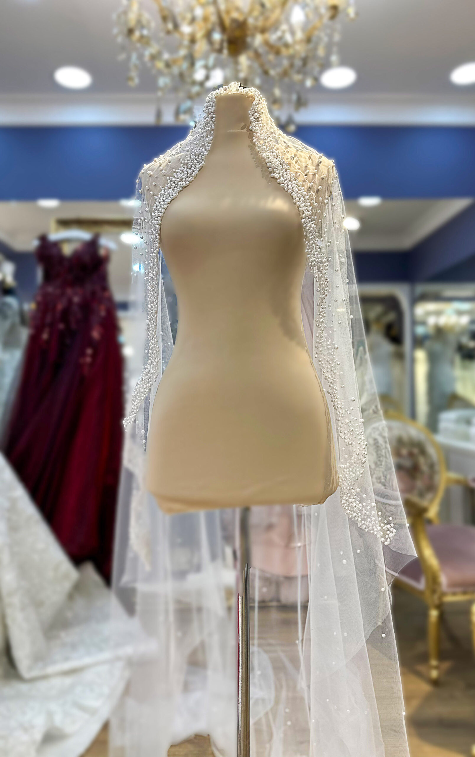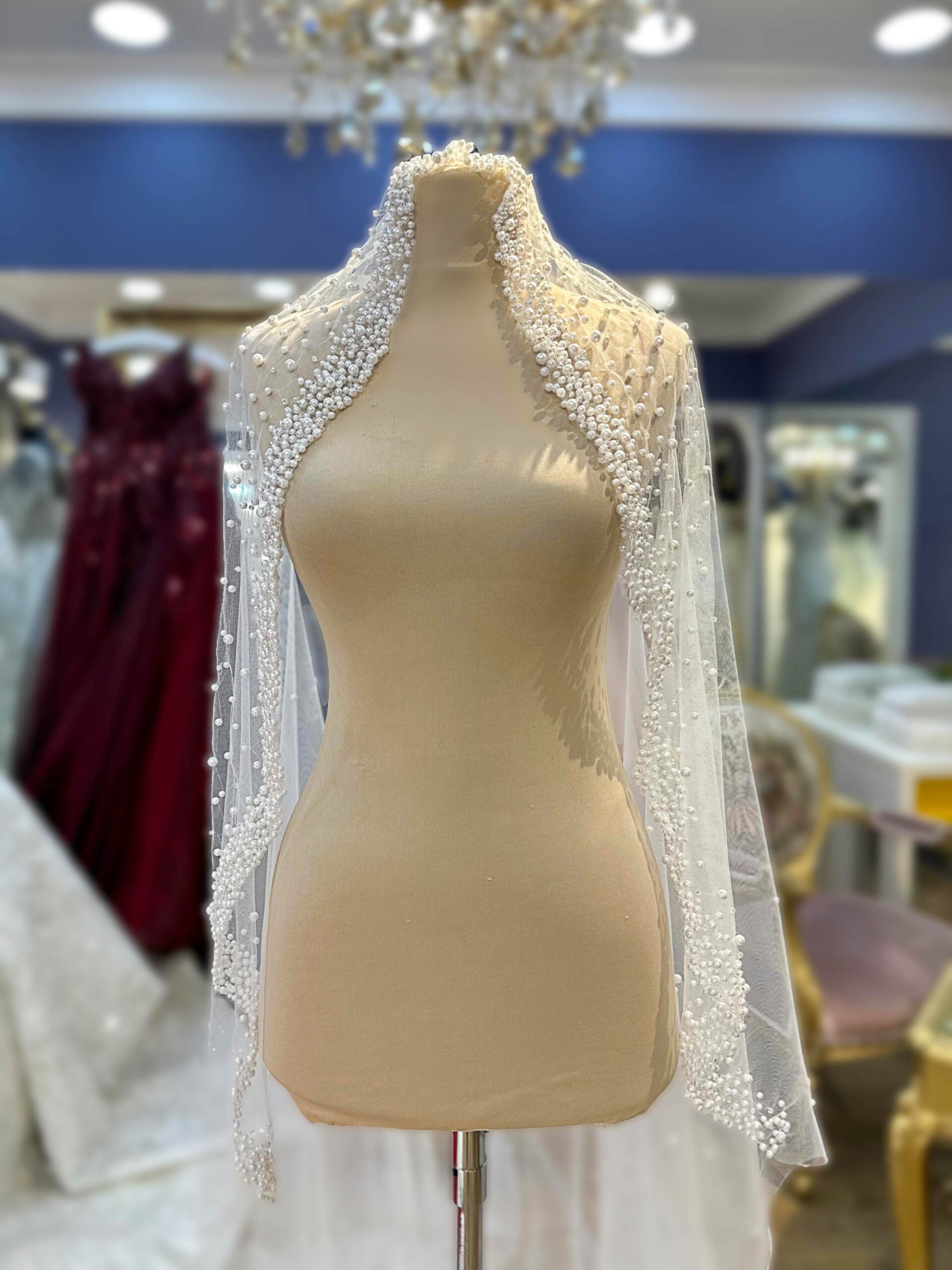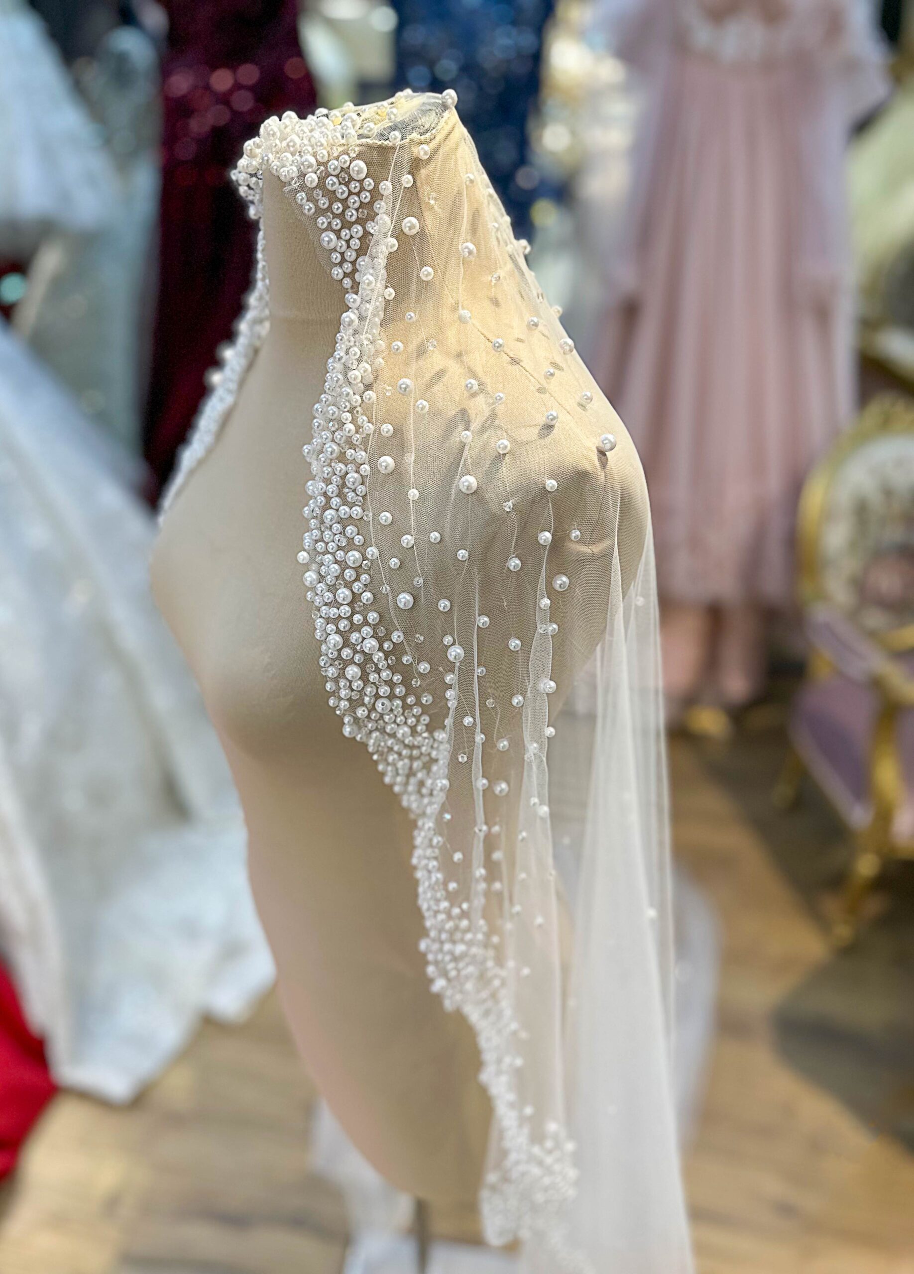 Zarif inci ve kristal işlemeleriyle süslenmiş tül kumaş, saf ve şık bir görünüm sunar.