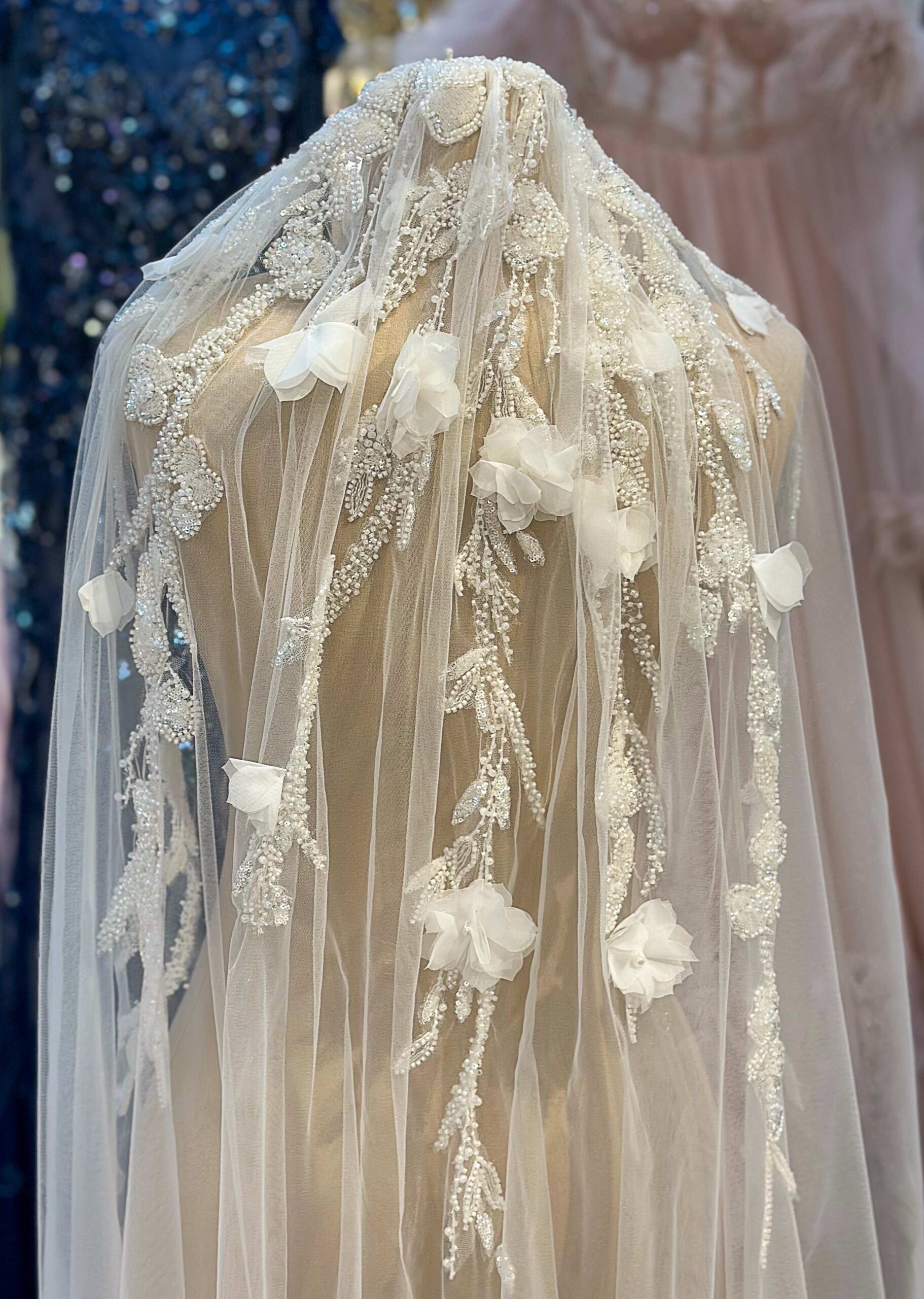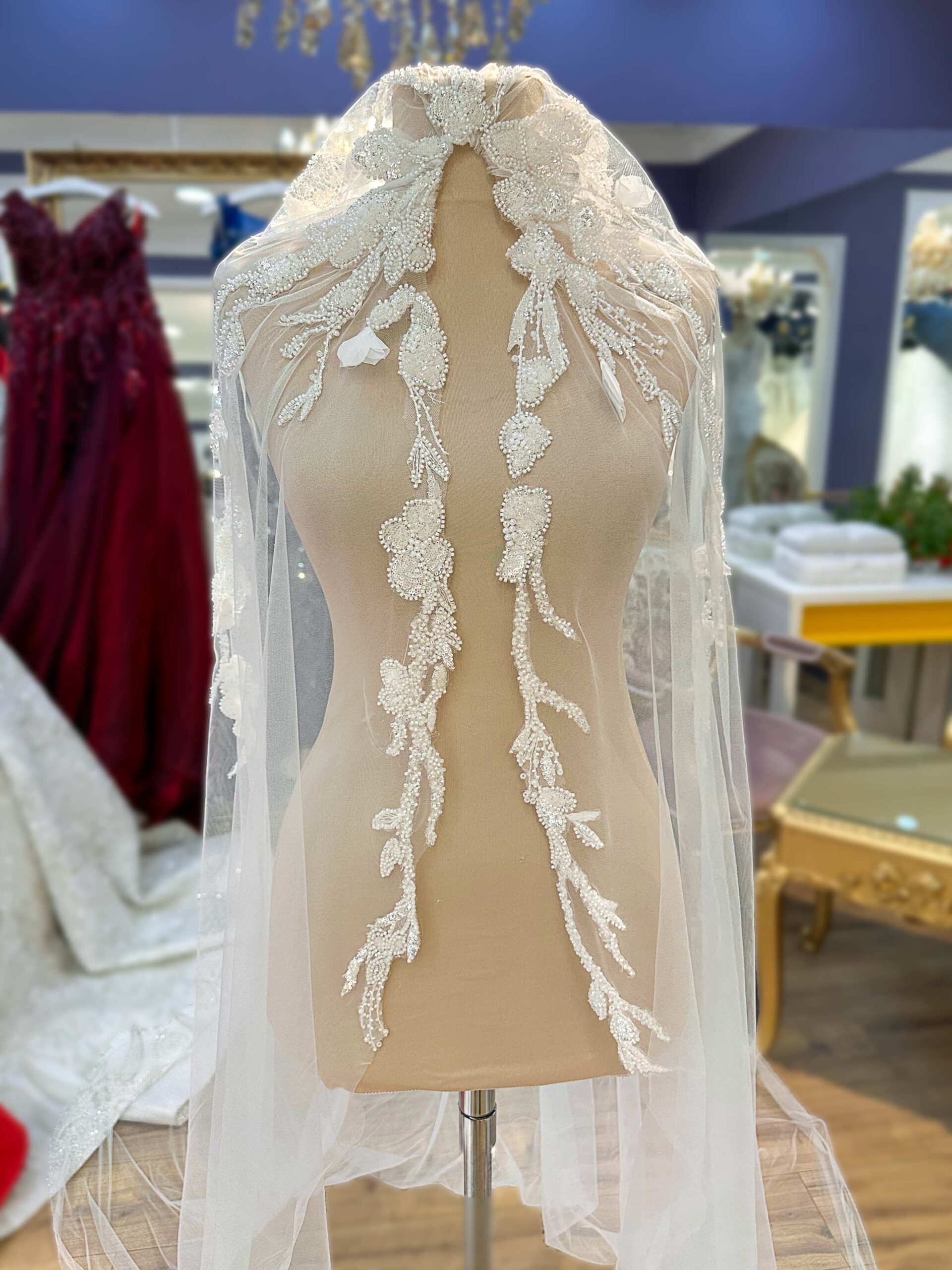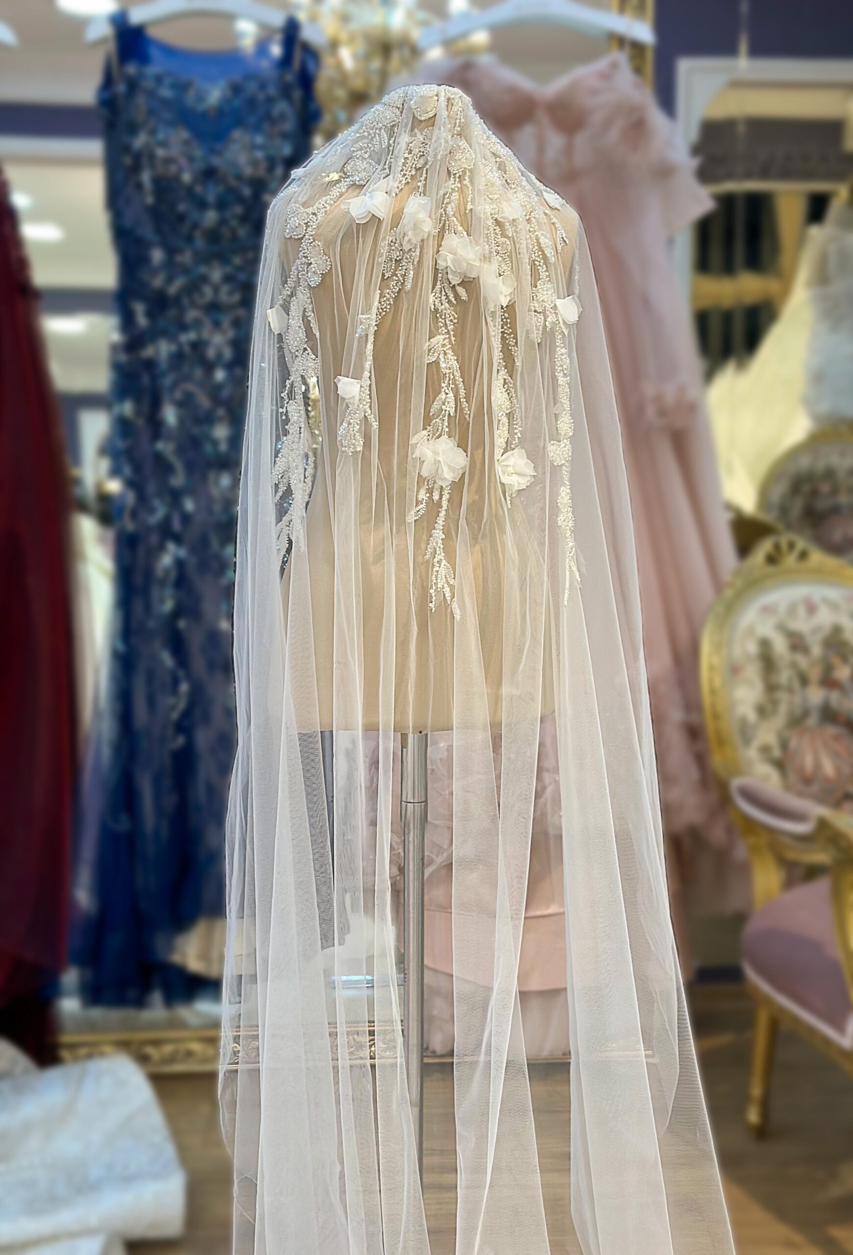 İşlemeli Üç Boyutlu Dantelli Tül Duvak