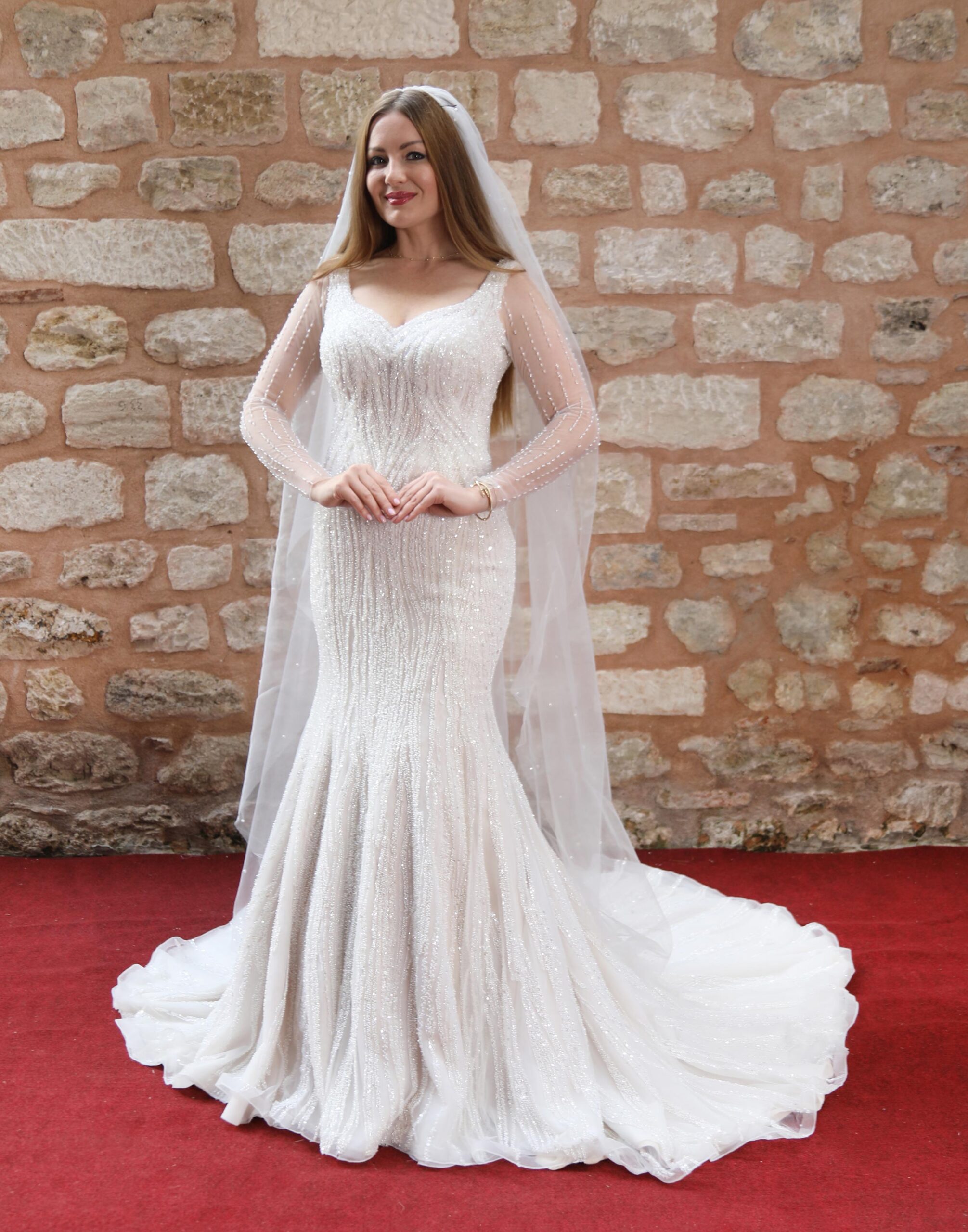 Zarafetin ışıltıyla buluştuğu bu krem rengi balık model elbise, komple kristal işlemeleriyle göz alıcı bir şıklık sunar. V yaka tasarımı feminen bir dokunuş katarken, uzun kolları asil bir duruş sağlar. Özel günlerinizde sizi yıldız gibi parlatacak bir parça!