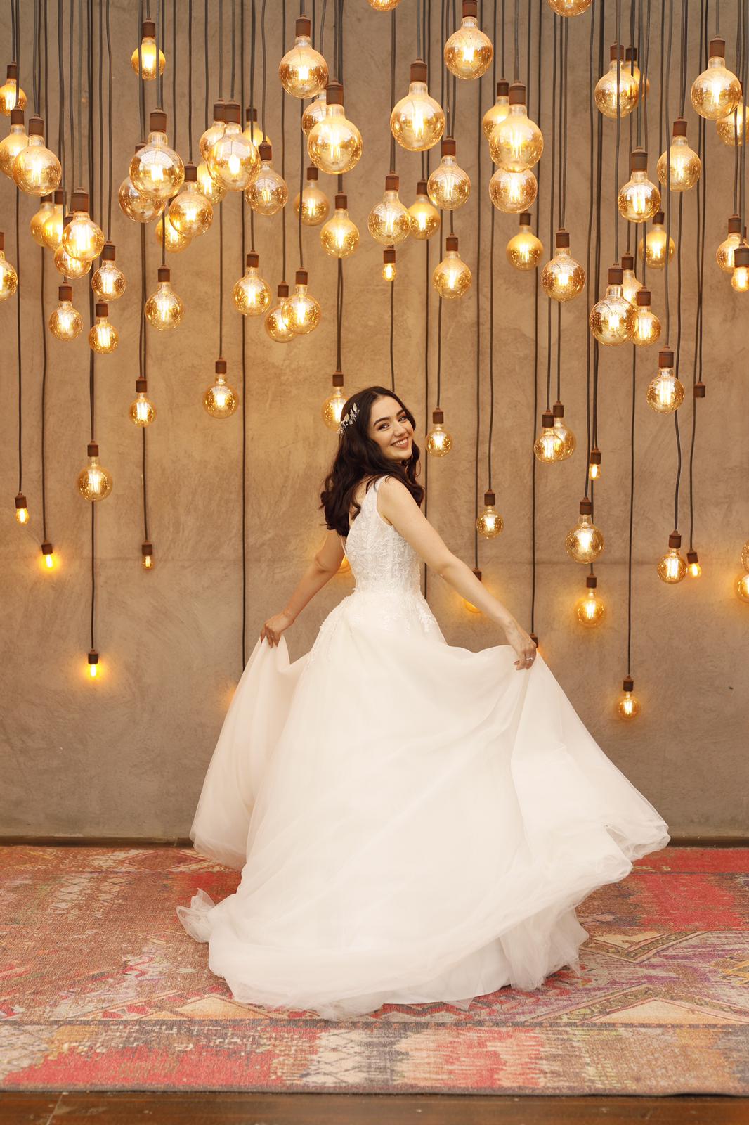 Bu gelinlik gerçekten tam istediğim gibi! İnce askılar ve v yaka, oldukça zarif bir duruş sağlıyor. Üst bedendeki dantel işlemeler çok şık ve modern. Tül etek kısmı da oldukça sade ve zarif, tam istediğim gibi. Balık model ya da kabarık modelleri sevmediğim için bu tasarım mükemmel oldu. Dağınık saçlarla ve doğal bir makyajla harika bir görüntü ortaya çıktı. Her mevsime uygun, çok rahat bir gelinlik.
