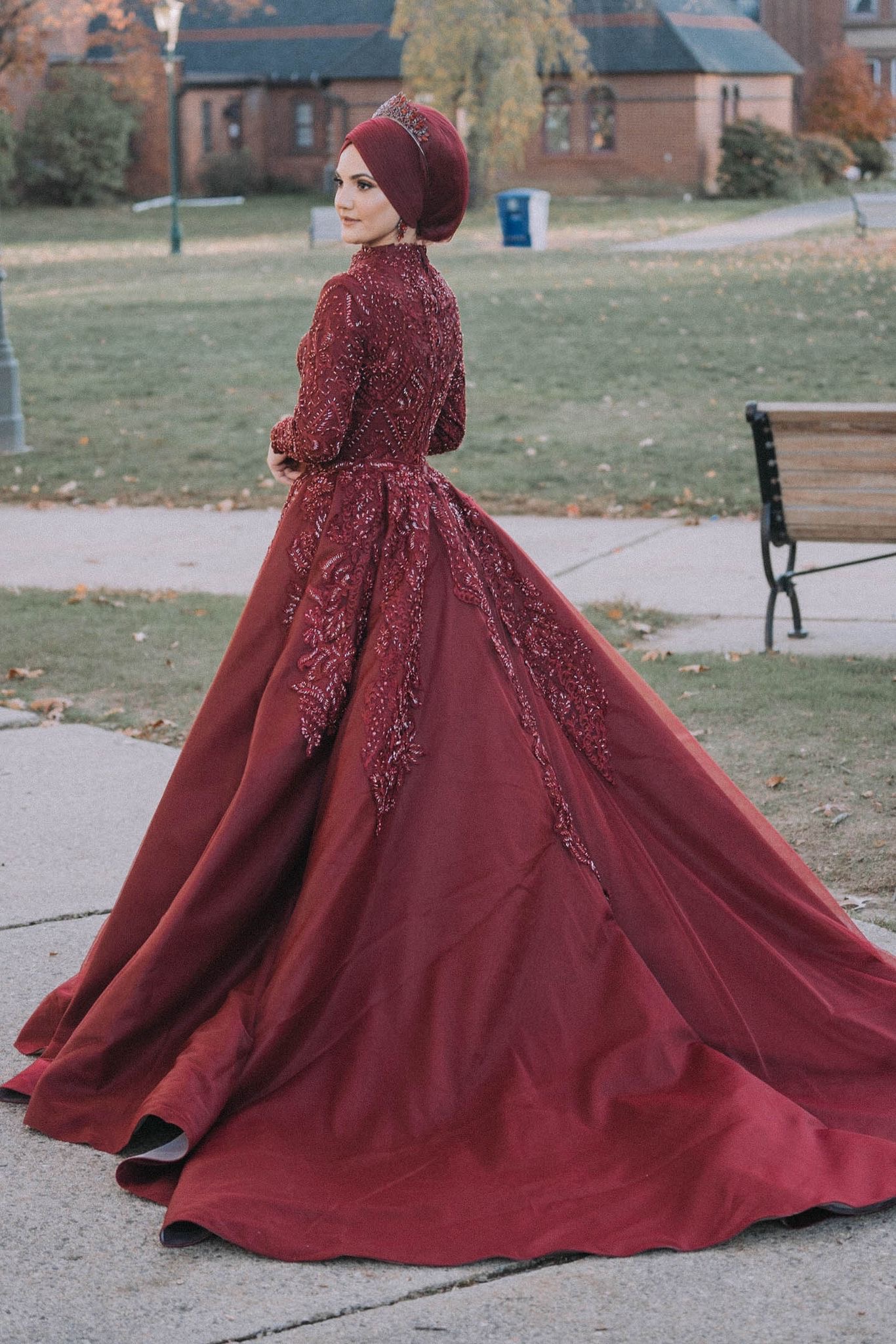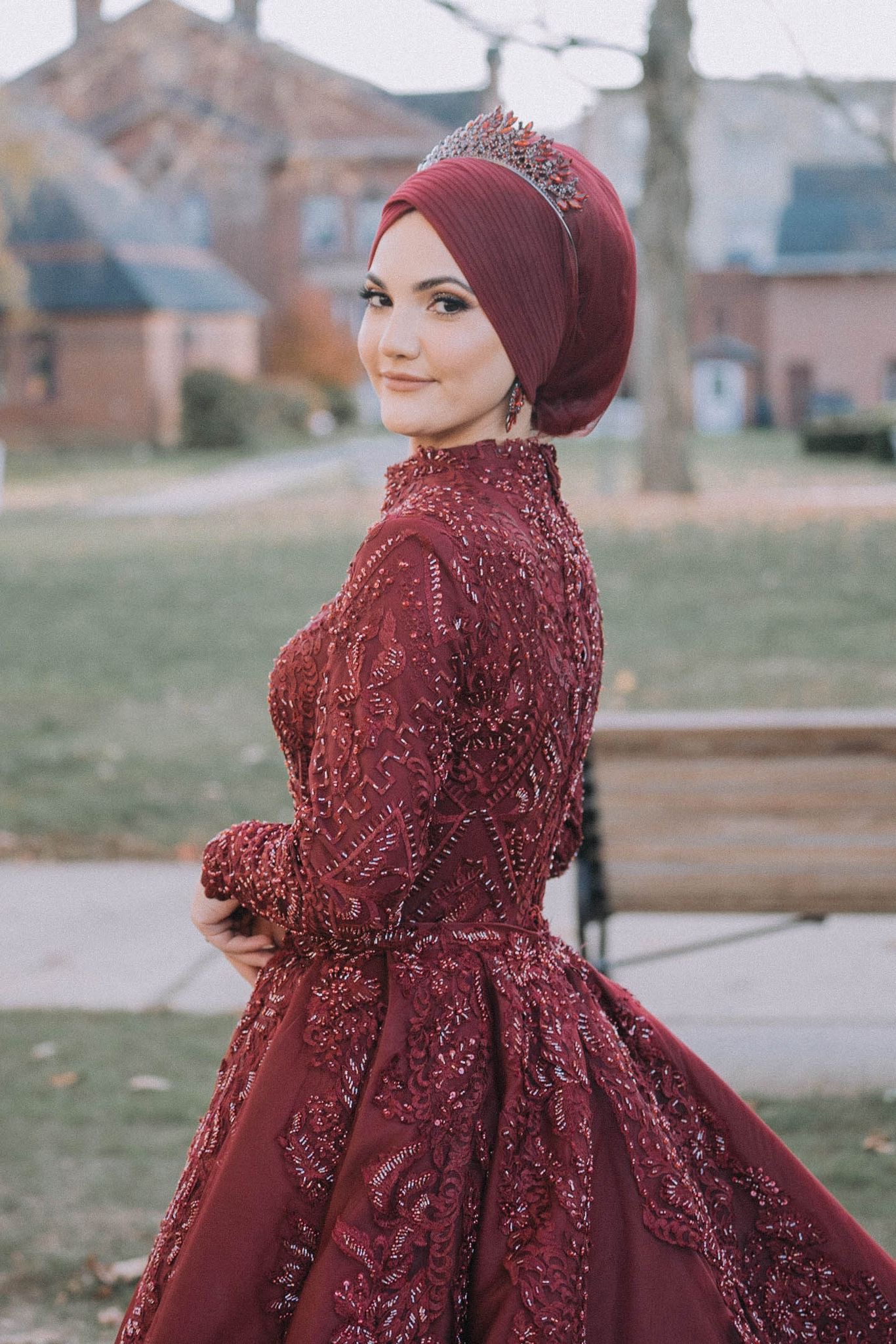 Dantelin zarafeti ve bordo rengin asaleti bir araya geldiğinde ortaya büyüleyici bir elbise çıkmış. Türbana da bittim bu arada.