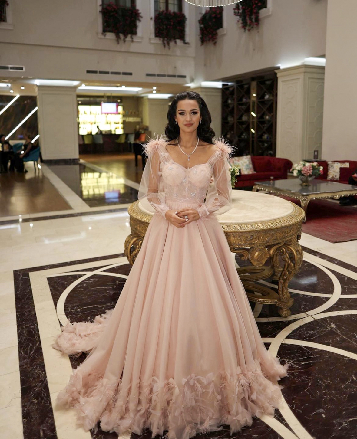 Romantik ve zarif bir görünüm sunan pembe tül elbise, askılı kalp yaka detayı ve balon uzun kollarıyla şıklığı ön plana çıkarıyor. A kesim silüeti sayesinde vücuda uyumlu ve akıcı bir duruş sağlar. Özel davetler ve özel anlar için mükemmel bir seçim!