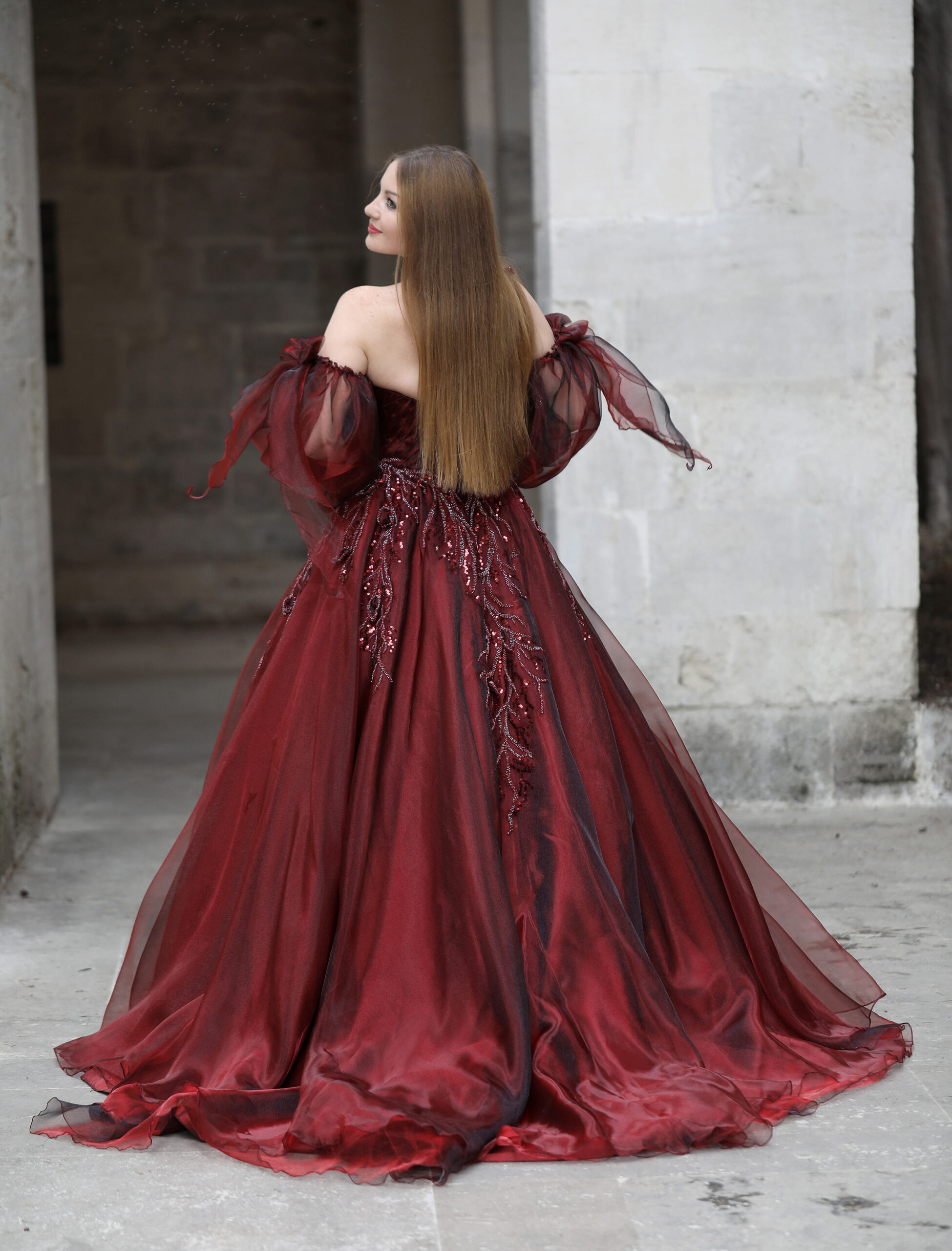 Zarif detaylarıyla büyüleyen kırmızı organze elbise, kalp yaka tasarımıyla romantik bir dokunuş sunarken balon kollarıyla hacimli ve şık bir silüet oluşturur.
